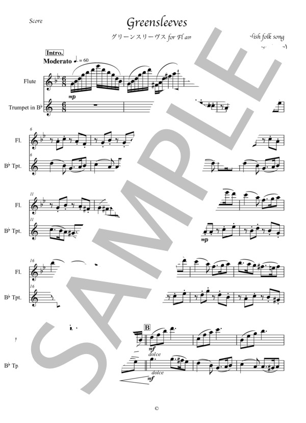 楽譜 フルートとトランペット コルネット グリーンスリーブス アンサンブル イギリス民謡 吹奏楽パート 初 中級 Piascore 楽譜ストア